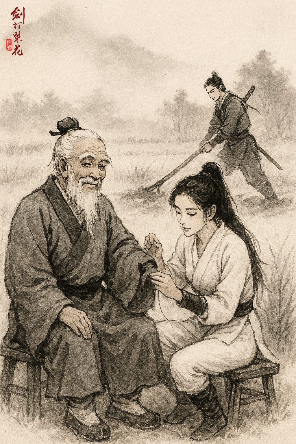 如此過了十多天,在老道士的幫助下,花尋楓和呂凌的傷勢已好了十之七八。呂凌見身子能活動了,便也下田幫忙,把粗重的活都幹了,算是報恩。老道士看了,笑了笑,不置可否。當天晚上,花尋楓又隔著雜物問呂凌道:「你下田幹活,是為了報恩吧?」呂凌道:「略盡綿力而已。」花尋楓道:「你忘了老道士的話嗎?生活就是修行。你把他的活都幹了,那他還修個什麼行?」呂凌聽了一怔,良久說不出話。花尋楓這才道:「要是想報恩,明天隨我出去一趟吧。」