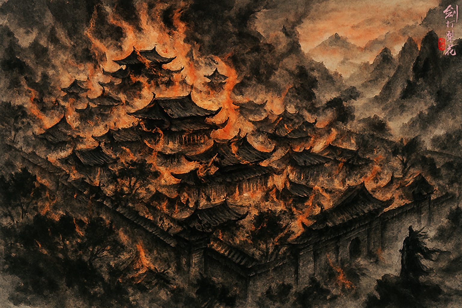 百會悄悄離開了現場,躲到一處無人的密林中,他覺得體內五臟都在痙攣,蜷縮著身子不停嘔吐,彷彿想把雙手犯下的罪行吐出來,卻始終徒勞無功。他的手下點起了三把大火,把三座百年大院連同裡面的人和屍一起,燒成了灰燼。熊熊烈火,光照雲霄,吞噬了宅院,彷彿也吞噬了惡人用血塗成的醜惡,吞噬了南宮山莊,彷彿也吞噬了百會心中僅存的一點良知,然而火舌衝天,彷彿意猶未盡,竟連天庭也想一併吞噬。