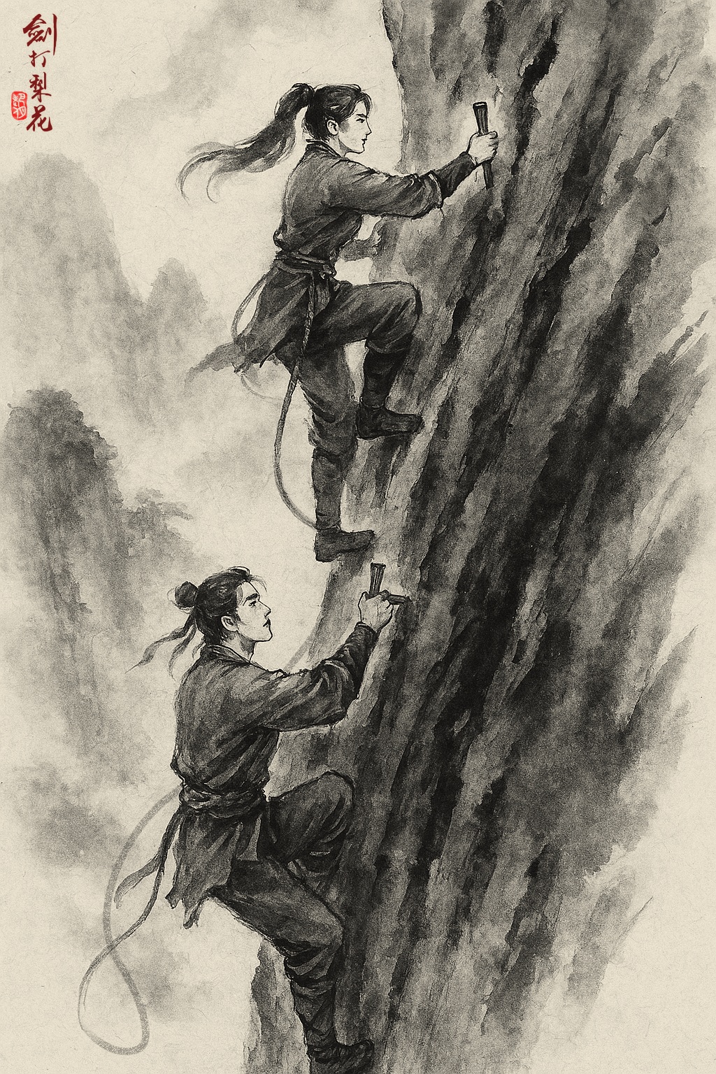 又過了幾天,兩人準備妥當,又和洞內的小動物們作了最後的道別,然後便要開始攀爬崖壁了。顧九月有習武的底子,攀爬起來大致不成問題,但是鐵無咎就難免力不從心。於是兩人先用這些日子收集到的蔓藤,一人一頭綁好,以便其中一人不慎失足時,另一人還可設法相救。兩人也準備好了數十枚削尖的小木樁,由顧九月先行,每爬數尺,便把小木樁打入石縫中固定好,如此鐵無咎攀爬起來,便容易許多。這十餘丈的路程說短不短,兩人也花了半天時間,才爬上崖頂,總算是有驚無險,安全抵達。兩人累得躺在崖邊,喘氣不已,想到脫離險境,重回人間,忍不住相視大笑起來。
