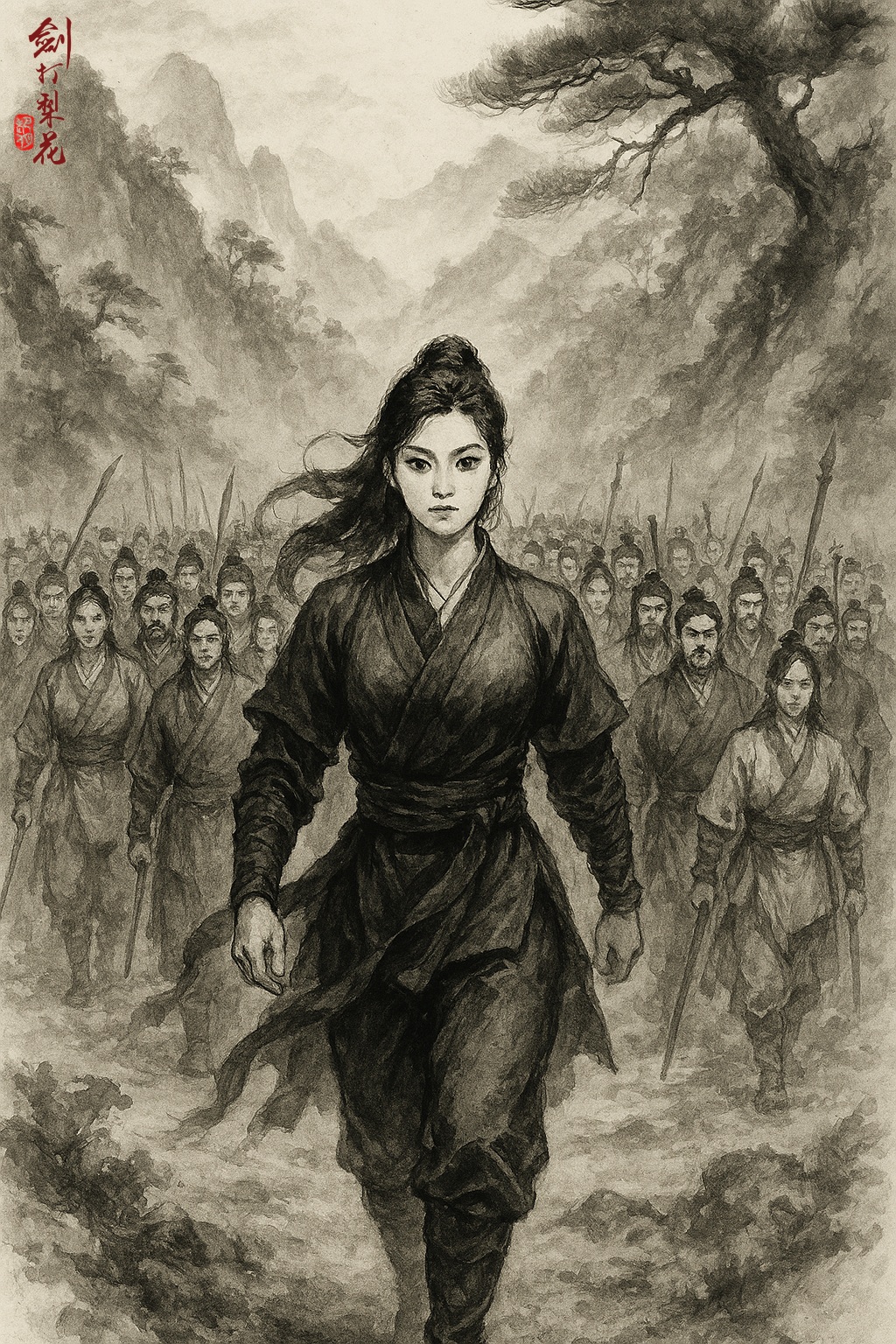 就在這時,突然聽見前方有人聲呼喝,三人好奇,沿著小路快步上前,來到一片小空地,一名女子手執長劍,和兩個用刀的黑衣蒙面大漢已然打了起來。空地邊上有一間破舊木屋,屋前站著三個人,一個年輕男子,一個中年婦人,還有一個十二三歲的男孩。花尋楓一看,喜不自禁奔了過去,喊道:「哥!」