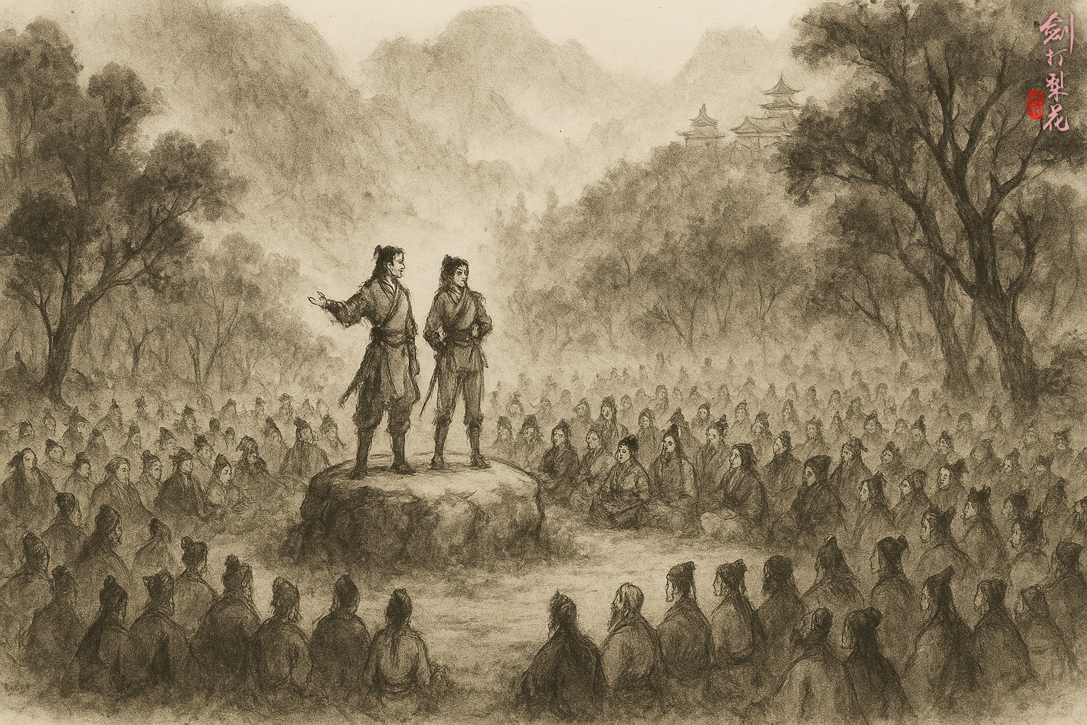 太乙觀沒有可以容納群雄的議事廳,於是大會只在三清殿前的空地上簡陋地召開。沒有華麗的排場,也沒有豐盛的宴席,大家席地而坐,翹首以待。