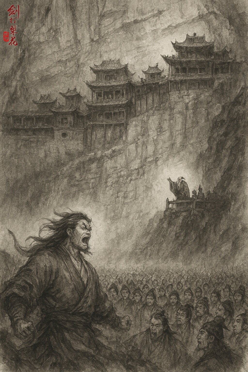 鐵劍門血案過去不久,眾人記憶猶新,一切事情都由此案開始。若說廣悟子此前所說的惡行,群雄都還無動於衷,那說到血洗鐵劍門、武林大會、攻打陀羅島幾件事,便與群雄有直接關係,不得不大為動容了。一時間場上人群議論紛紛,鼓譟不安,都嚷著叫風長聲解釋清楚。風長聲聽到此處,再也忍耐不住,突然猛喝一聲:「血口噴人!」身子一躍而起,竟不顧凶險,朝棧道上的無塵子打了過去。他雖然沒有十足把握,但眼下除了戰勝無塵子,帶領弟子殺上棧道,根本無法再平復群雄的疑心。無塵子見狀哈哈大笑道:「風長聲,等你好久了!」他拔出長劍,迎面而上,兩人就在棧道上打了起來。