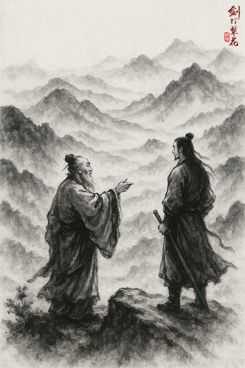 萬老叟回道:「蒼龍年事已高,況且其心不正,不可託付。元陽子身負太乙觀住持大任,難免偏心自家門戶。渡相佛法修為高遠,出世太深,亦難擔此任。」他走到崖邊,指著山下開闊的遠景,繼續道:「既臨絕頂,何足再攀。二公子劍法高絕,已然獨步天下。得此書,或傳之於人,或補己不足,老朽都放心得很。」