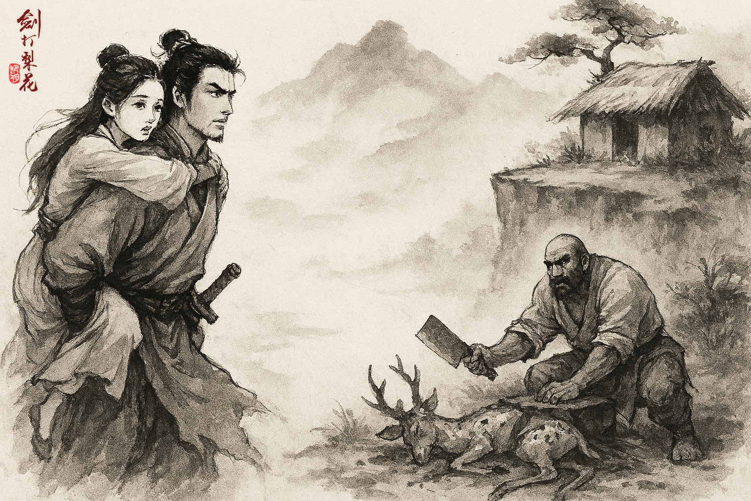 兩人修整了一下,再繼續往前走。按藥先生指示,再走了半里路,便見到山崖邊一座小茅屋。茅屋前有一和尚,身穿灰白僧袍,約莫四五十歲,一臉又黑又硬的絡腮鬍,雙目有神,身形壯碩。最奇怪的是,他竟然正蹲在地上,手拿菜刀,在宰殺一頭梅花鹿。看他手起刀落地把死鹿分屍,哪像一個和尚?分明一個屠夫。