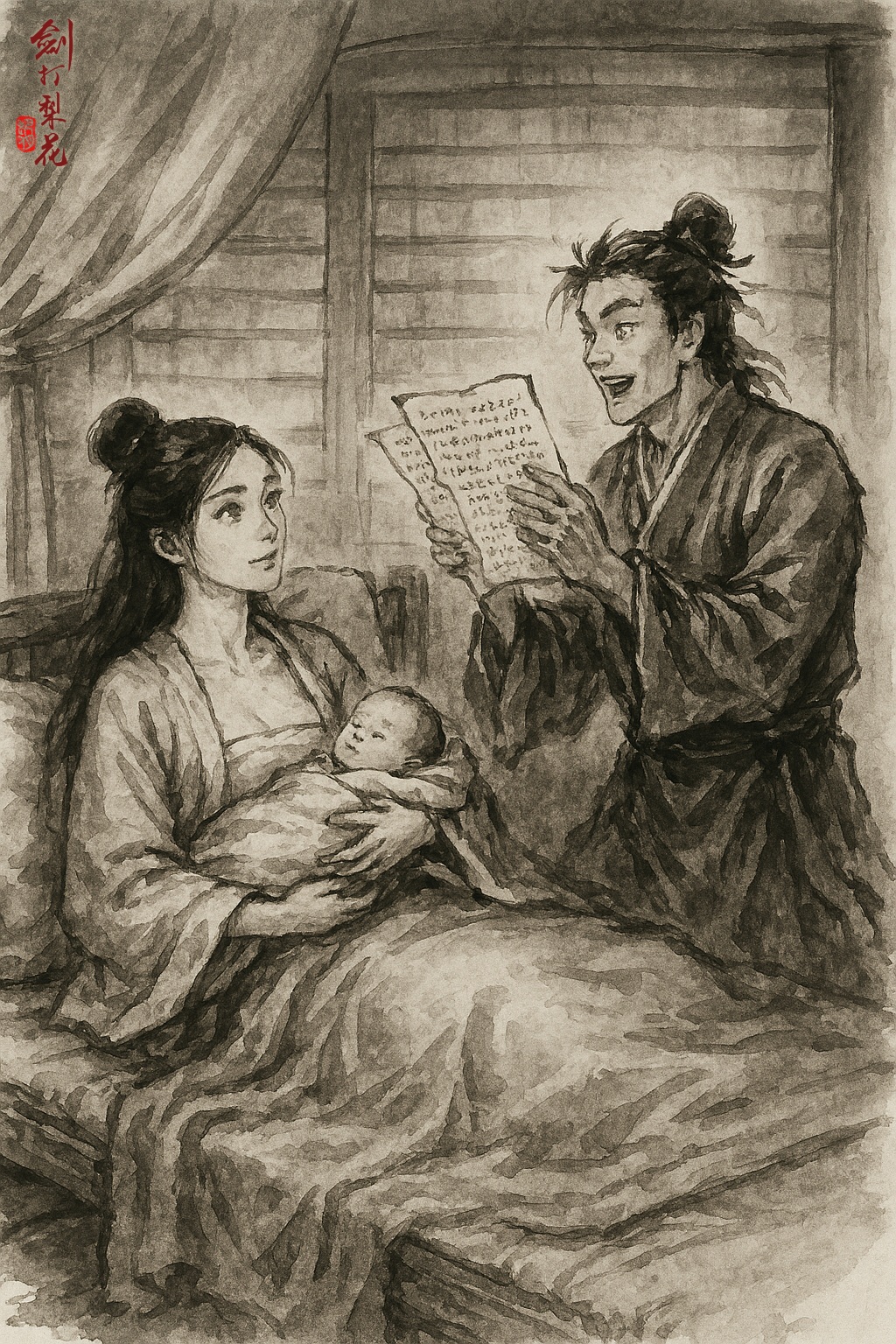 如此又過了半年,花杏兒順利產下一個兒子。梁人鳳不敢違背諾言,便說:「杏兒,此子雖非我親生,但我承諾過待他如己出。他便跟我姓梁,名字由你來取,可好?」