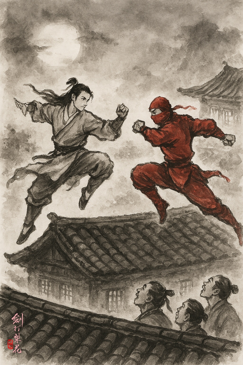梁人鳳見機不可失,當機立斷,口中喝道:「哪裡逃!」瞬間出手,朝丁香打去。丁香沒想到屋頂還有人,大吃一驚,急忙還手招架。兩人身在屋瓦之上,瓦面崎嶇,又斜又滑,丁香繼續施展起高超的輕功,一邊出招一邊騰挪遊走,如履平地。梁人鳳施展起「飛狼踏雪」輕功,也不遑多讓,在瓦上跳躍騰縱,絲毫不落下風。他沒有攜帶兵刃,於是以掌為刀,灌滿內勁,一招招血狼神刀法,朝丁香招呼過去。