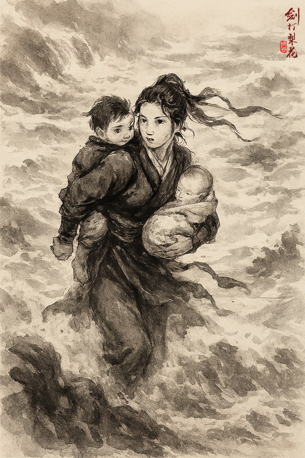 花杏兒緊緊抱住了一對兒女,心驚膽顫,慌忙中扯下腰帶,把三人緊緊和船艙柱子綁在一起,才不至於被拋走。好在船家好本事,臨危不亂,極力控制著船身方向,漸漸向河岸駛去。此時河水漲起不少,原先河岸早被淹沒,新河岸推遠了十餘丈地。靠近河岸河水緩和下來,船家叫大家趕緊跳船逃生,花杏兒不識水性,心裡怕極,但見所有人都跳了,只好一咬牙也跟著一起跳下,此處水深及腰,她一手抱著一個孩子,不顧一切地往高處走去,好不容易才總算上了河岸。