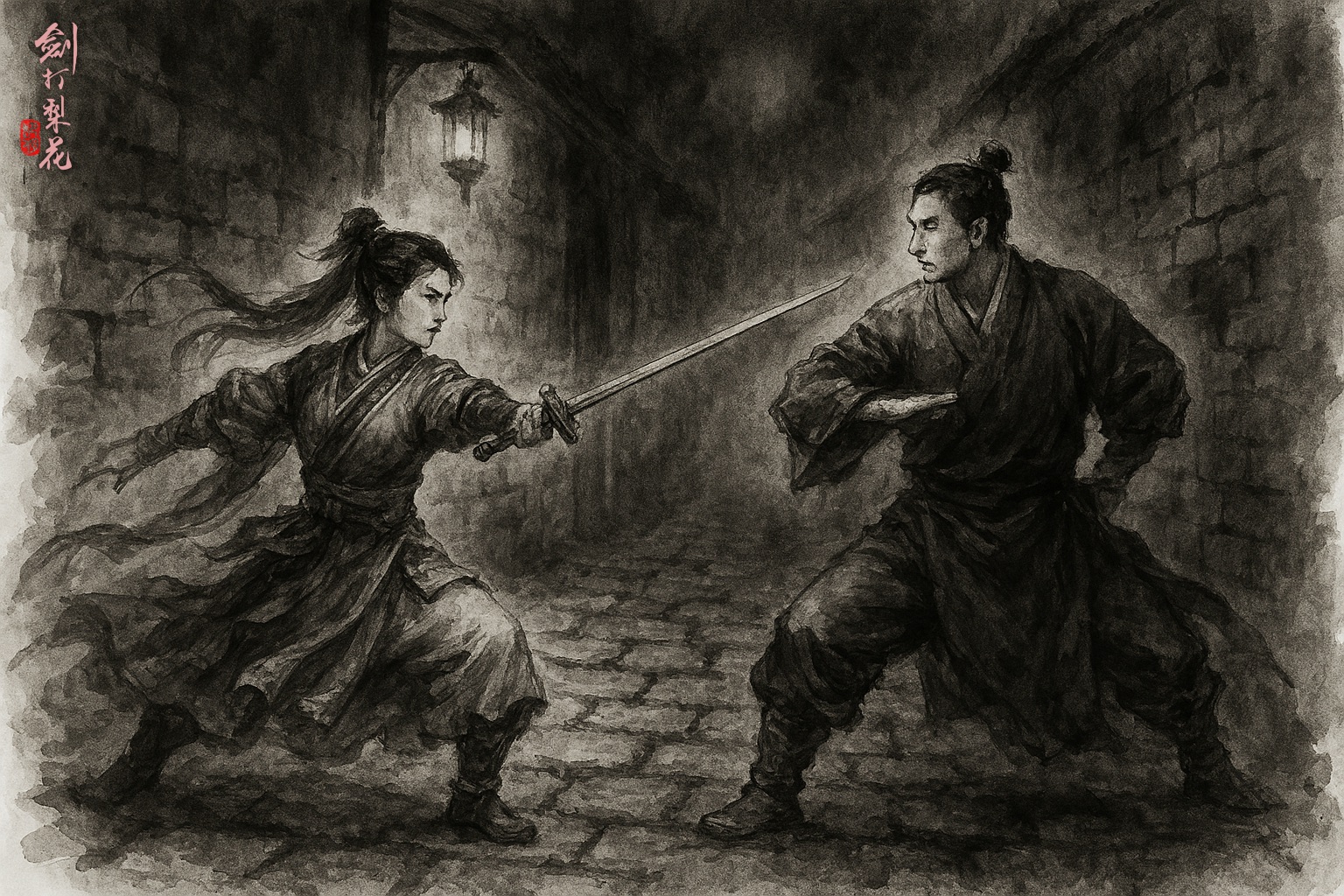 南宮真睡至半夜,突然一陣慘叫聲劃過夜空。南宮真驚醒,心下一凜,提了長劍便立即穿窗而出,朝叫聲奔去。叫聲不遠,離客棧只隔了兩棟樓房,南宮真跑到附近,突然一條人影從房子中倏地竄出,南宮真心下一喜,拔劍趕上,把他截住,喝道:「何方小賊,在此作惡!」說著舞起劍花,便往對方刺去。