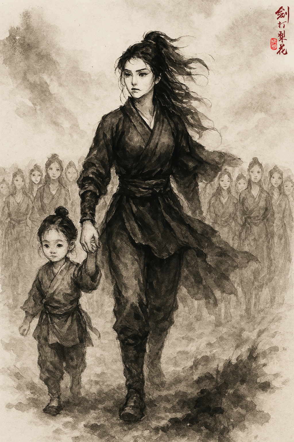 花杏兒轉身牽回女兒,對一群婦女道:「大家快走吧,回家去,遲了歹人只怕又回來了。」一部分婦女匆匆離去,有一大半卻留下了不走。剛才喊話那少女名叫小蘭,此時忽然跪下哭道:「強盜把我家人都殺死了,我無家可歸,請女俠收留我,讓我跟著你走吧。」她開了個頭,其他人也一個個跪下哭訴,有的像小蘭一樣,有的被姦污沒臉回家,有的說自己無親無故,都請跟著花杏兒。花杏兒苦笑道:「我自己也是泥菩薩過江,無處可去,怎能帶上你們呢?」小蘭道:「既然都是天涯淪落人,何不團結起來一起過?女俠你武功高強,我們跟你學,做你的徒弟!」