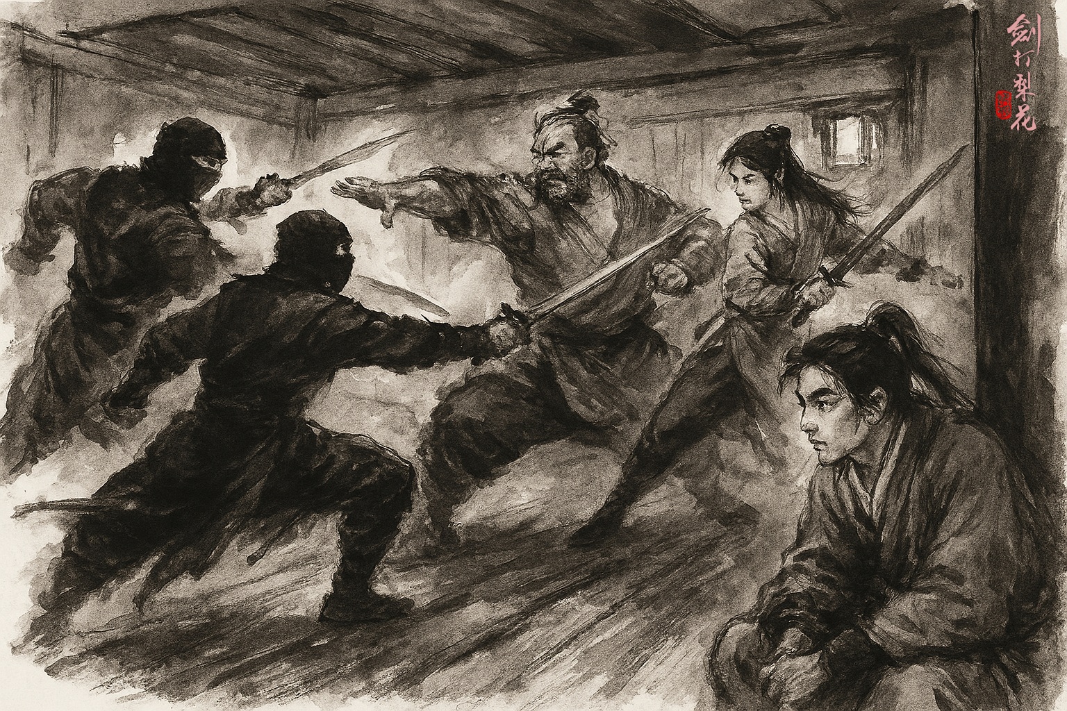 話音剛落,突然聽見有人陰陽怪氣地笑道:「太遲了,我們已經來了!」然後「咣當」一聲巨響,頭上樓瓦爆裂碎開,兩個黑衣蒙面的男子,手持單刀,落了下來。原來這兩名殺手早就到了,只是礙於船上戒備森嚴,遲遲不敢動手,難得等到顧三娘上船一攪,把巡邏的人都引到一邊去,他們便立刻乘虛而入。