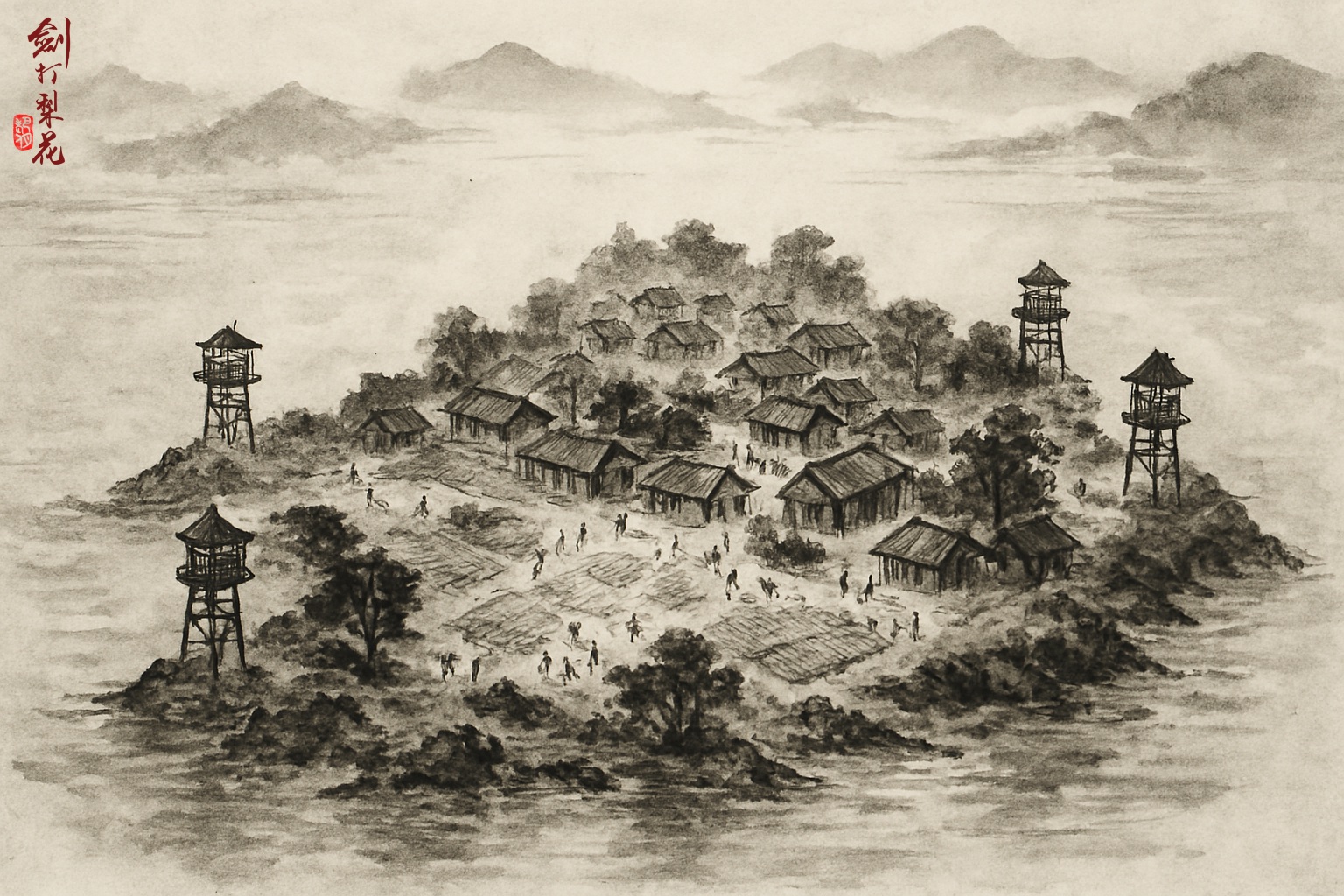 竹筏平安抵達對岸,鐵無咎一行人陸續上了島,才終於看清了島上面貌。這島方圓兩三里大小,甫一上岸,便看見了一座兩丈許高的瞭望塔,塔上有女子駐守,算是警衛,沿岸也有女子在例常巡邏,戒備雖算不上森嚴,但也不是外人可以隨便入侵。往島內看,不遠處稀稀落落蓋了許多小木屋,木屋間都是大大小小的農田耕地,屋裡屋外可見許多年輕婦女,在燭光下或勞作或炊食或織布縫衣,偶爾還可以見到孩童戲耍,除了看不見男人,與島外農村並無二致,且更多了幾分安祥淳樸。
