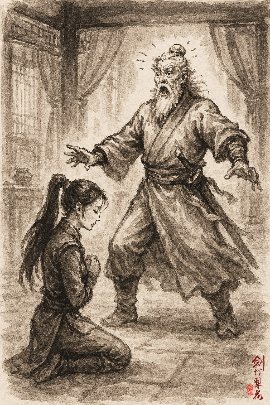 花杏娘帶著女兒,轉到議事廳門前,大門此時已被一道石門封死,密不透風。她急匆匆來到這裡,此時卻又猶豫不前了。她在石門前徘徊了幾圈,臉色陰晴不定,時而緊張,時而憂慮。她當年背叛了丈夫,跟其他男人離家出走,如今有何面目再見家翁?她當年保護不力,害兒子身受重傷,終身難癒,最後拋夫棄子,如今有何面目再見兒子?算來今年兒子也二十歲了,他是長得像師郎呢?還是更像自己?這些年娘親不在,日子過得如何?
