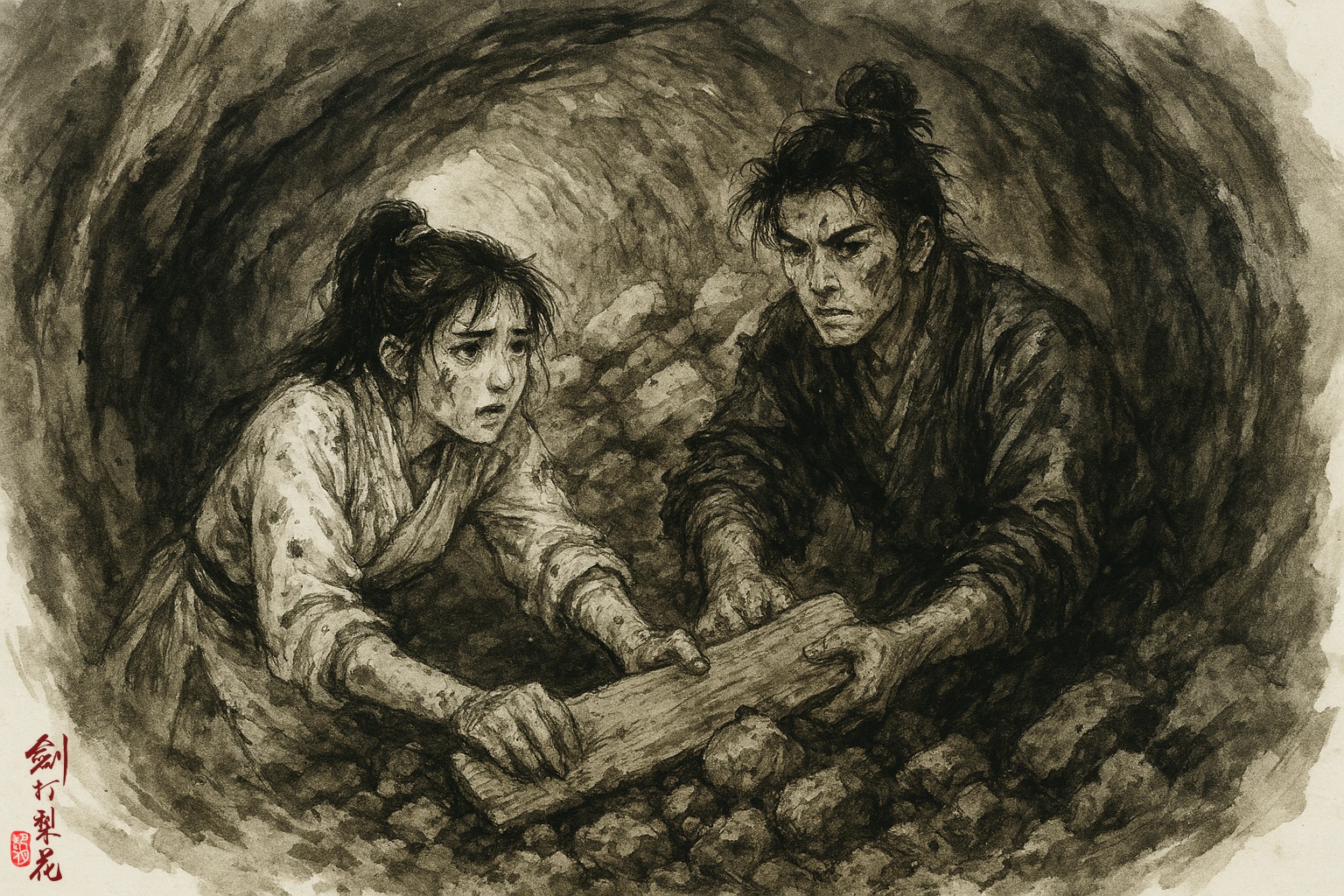 也不知挖了多久,在閃爍搖曳的火光下,呂成凌滿臉污泥,汗如雨下,終於不得不坐下歇息。他彷彿信心開始動搖,喘著氣道:「或許你是對的。或許在渴死以前,我就先累死了。」就在他想要放棄之時,花尋楓卻撿起了木板,接著挖了起來。她邊挖邊說:「說不定便只差一寸了,現在放棄,豈非可惜?」