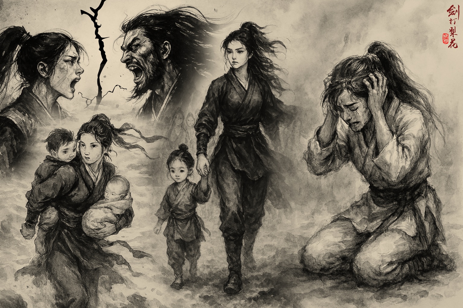 花杏兒對梁人鳳的離開百思不解,傷心欲絕,偏偏在這時,卻發現自己又已懷了梁人鳳的孩子,不久後便生下一女。有道是為母則強,她只好堅強起來,面對生活,好好撫養一對兒女。過了好久以後,一次機緣巧合,她終於發現了梁人鳳的陰謀。原來梁人鳳誘她離家,其實只是為了得到她身上一篇父親留下的武功口訣,騙到手以後,他便再一次無情地拋棄了花杏兒。得知真相的花杏兒,無比羞愧,她把年只三歲的兒子,還給了鐵乘師,自己卻無顏留在鐵劍門,於是帶著女兒離開,隱居起來。