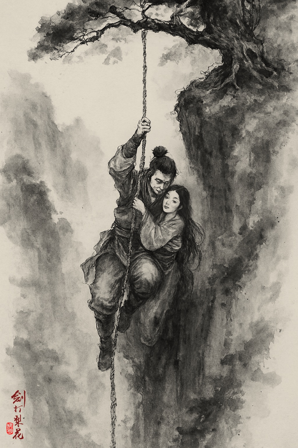 於是兩人和好,從這天起認真搓繩索。花晨武以為玉奴心裡有委屈,對她是更加疼愛,兩人依舊如漆似膠,只不過玉奴眉宇之間,始終藏了一絲憂愁。又過了四、五天,繩索已足,兩人把繩索一頭系在崖邊一棵大樹上,另一頭丟下山崖,花晨武背著玉奴,拉著繩索,緩緩垂吊下山。玉奴回想上一次掉下山崖,也是如此緊緊抱著花晨武,不過十多天光景,山崖依舊,人事已新。上一次只不過瞬間的事,感覺卻是好久,這一次慢慢下降,卻總覺時間過得太快。