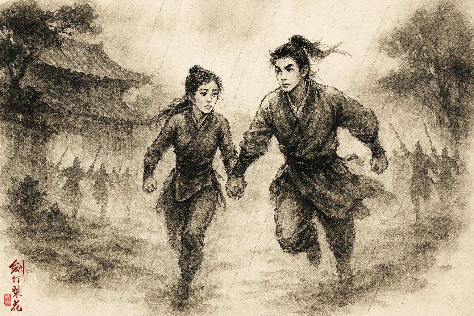 胡成亭聽說二師兄有難,一抱拳,便頭也不回地急急離去。鐵無咎拉著顧九月來到牆邊,找到水洞,順利穿出院牆。回頭一看,只見院內廚灶小院的火勢漸漸燒大,火光也映紅了漫天飄舞的雨點。可惜雨勢不停,這場火始終難以造成什麼傷害。趁著夜色,冒著細雨,兩人牽著手一路往東而逃。