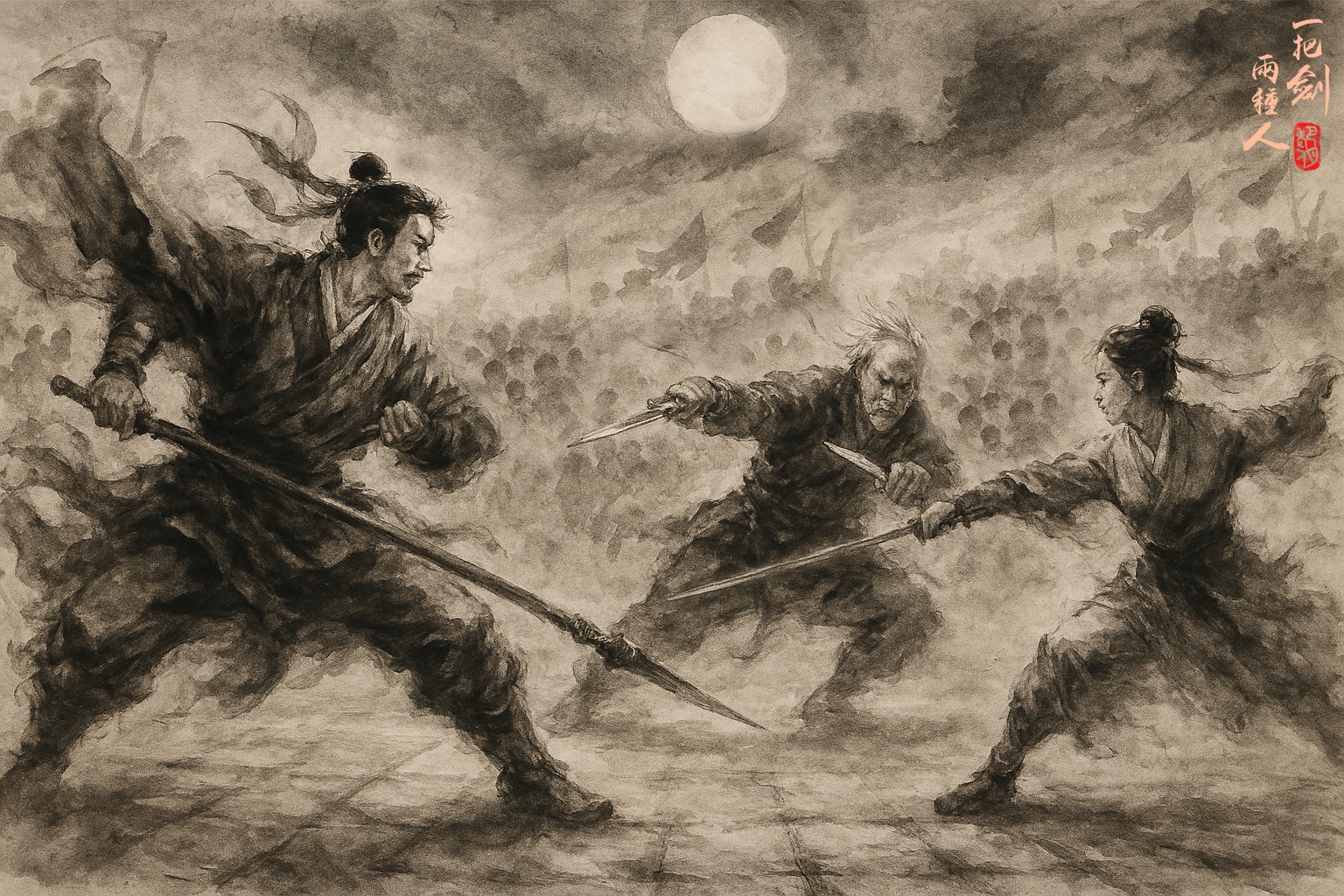 交鋒十餘合,趙切氣息漸促,額角見汗,旁人或看不出,但他自己心知,內息早已紊亂。但何長嘯卻仍游刃有餘,迅速變招,順勢一躍跳起,半空中一招「高山流水」,槍勢如雨落下。趙切回刀擋架,險象環生。這時忽聞一聲:「我來助你!」劍光乍起,一個身影手執三尺青峰,不知從何處而來,射向何長嘯。何長嘯微微一驚,半空中急忙扭身擋架。