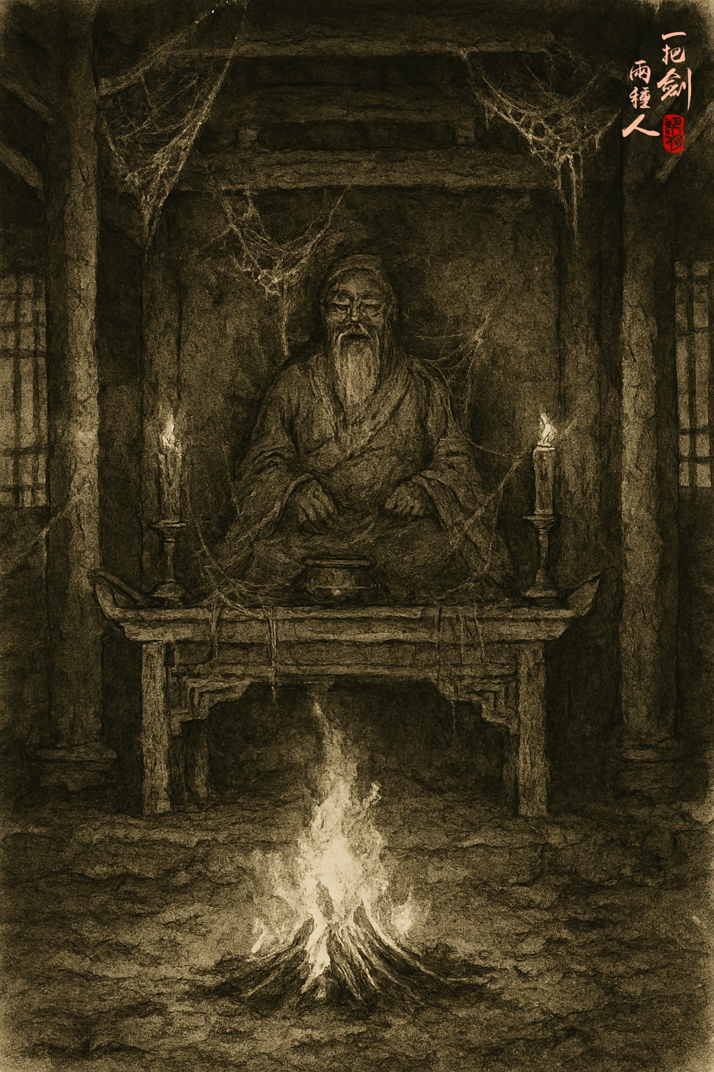 月老廟早已荒廢,大門本來是上鎖了,但此時走近一看,門鎖卻已被人破開了,大門只是虛掩著。她輕輕推門,放輕腳步,走了進去。穿過院子,走進大殿,殿裡正中,生了一堆篝火,燒得正旺,把四下照得明亮。環顧一看,不見有人,卻只見香案積塵,蛛網密佈,兩旁紅燭殘痕斑斑,供桌後那尊月老神像,衣袍褪色,滿臉灰塵,手中紅繩早已斷裂散落,彷彿預示著姻緣破敗。篝火旁,散落著幾塊乾糧燒餅,一隻酒壺,還有幾條繃帶,血跡斑斑,火光下,鮮紅得觸目驚心。