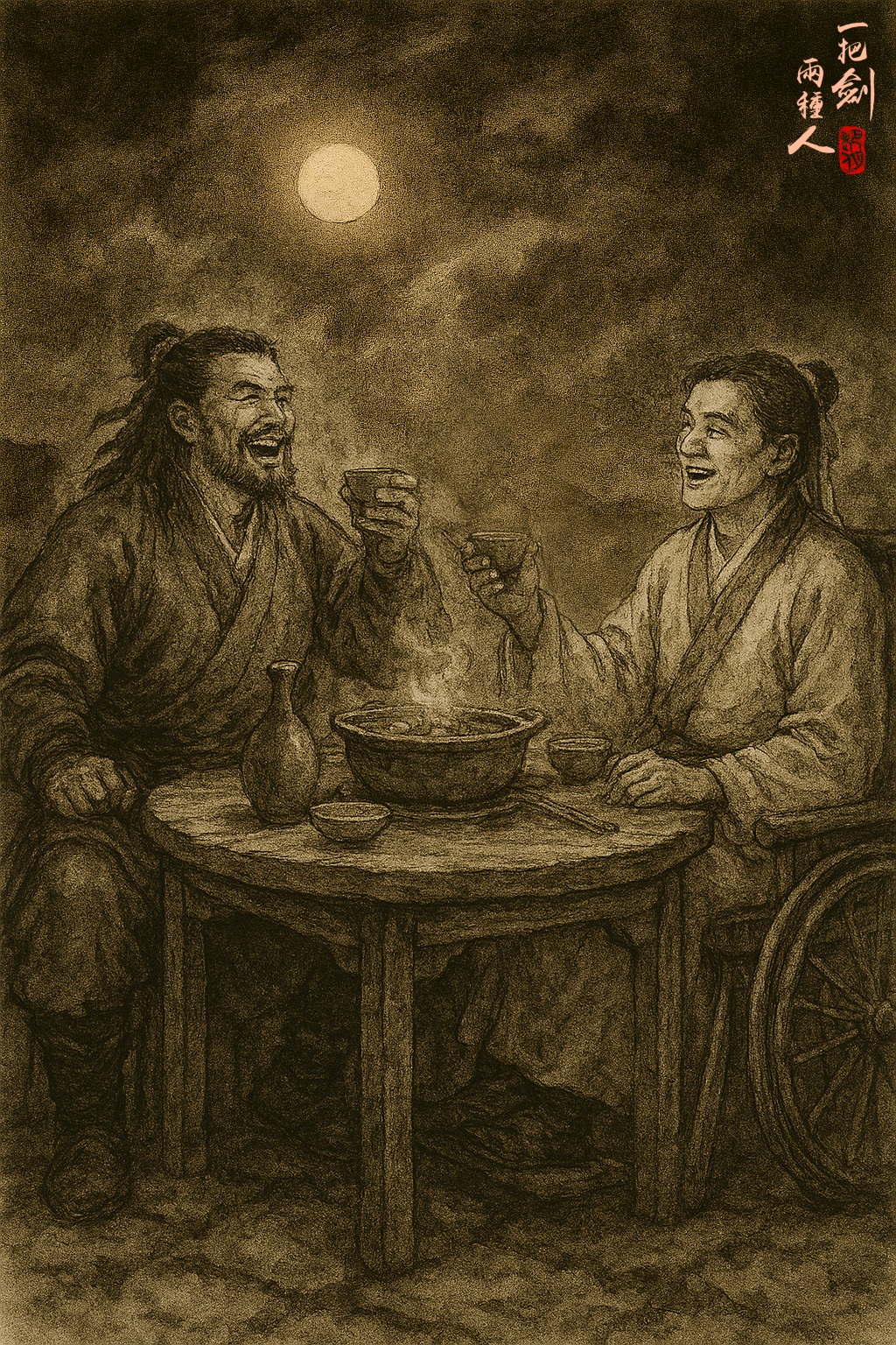郭大膛與姚總管已退下,只留下司徒不平與黎空谷在院子中,一邊喝酒吃肉,一邊暢談敘舊。兩人碰杯對飲,各訴別來經歷。過去一年,對司徒不平而言,最大要事,莫過於青雲宮之變了。聖劍失竊、宮父失蹤、三名心腹臂膀接連遇害,件件都叫他心煩氣躁。但他有個規矩,在這立冬之夜,與摯友相聚,只談風月,不談公事。